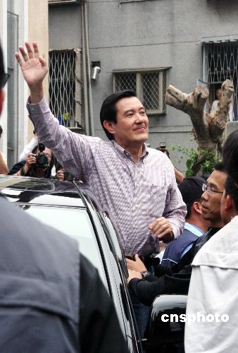 馬英九在臺(tái)北一個(gè)投開(kāi)票所投票后,離去時(shí)向民眾揮手致意。