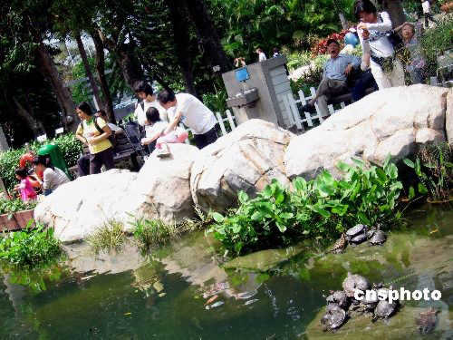 三月二十九日,香港眾多市民在香港公園享受輕松時光,水池中的烏龜也浮出水面,停駐在礁石上享受春天陽光的溫暖。中新社發(fā) 王麗南 攝