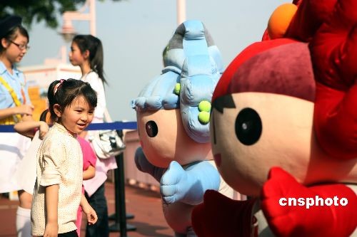 四月六日,香港大埔海濱公園舉行大埔迎奧運(yùn)嘉年華,向市民宣揚(yáng)奧運(yùn)精神,并加深對(duì)香港協(xié)辦的奧運(yùn)馬術(shù)項(xiàng)目的認(rèn)識(shí)與熱愛(ài),中國(guó)香港體育協(xié)會(huì)暨奧林匹克委員會(huì)會(huì)長(zhǎng)霍震霆、香港民政事務(wù)局局長(zhǎng)曾德成等出席活動(dòng)。圖為小朋友與奧運(yùn)福娃親密接觸。中新社發(fā) 武仲林 攝