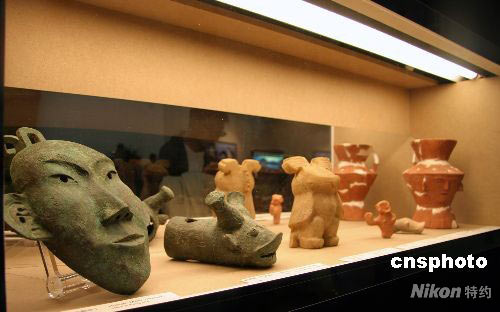傅斯年等人八十年前奉“中研院”院長蔡元培之命于廣州創(chuàng)立的“中研院”歷史語言研究所今年慶八十華誕。5月10日,該所舉辦展覽,將商朝馬車、漢代石刻畫像拓本等珍貴文物以數(shù)字化方式呈現(xiàn)于臺(tái)北“臺(tái)灣民主紀(jì)念館”。圖為展覽中陳列了該所發(fā)掘的三千年前西北岡遺址青銅人面(左一)的仿制品等。中新社發(fā) 劉舒凌 攝