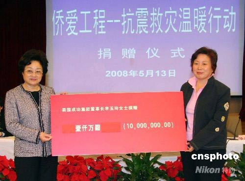 5月13日,國(guó)務(wù)院僑辦舉行“僑愛(ài)工程--抗震救災(zāi)溫暖行動(dòng)”捐款儀式,海外華商代表向國(guó)務(wù)院僑辦李海峰主任轉(zhuǎn)交了救災(zāi)善款。目前僑辦共收到泰國(guó)正大集團(tuán)、美國(guó)成功集團(tuán)董事長(zhǎng)李玉玲女士等各界僑商的捐款共計(jì)6850萬(wàn)元人民幣。圖為國(guó)務(wù)院僑辦李海峰主任(左)接受美國(guó)成功集團(tuán)董事長(zhǎng)李玉玲女士(右)捐贈(zèng)的1000萬(wàn)元人民幣。
