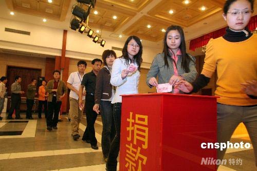 5月13日,國(guó)務(wù)院僑辦暨直屬單位在北京舉行為四川地震災(zāi)區(qū)捐款活動(dòng)。5月12日下午,四川省汶川縣發(fā)生7.8級(jí)大地震,四川部分地區(qū)受災(zāi)嚴(yán)重,這場(chǎng)災(zāi)難牽動(dòng)著全中國(guó)人民的心。中新社發(fā) 張勤 攝