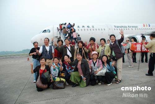 5月16日晚8時(shí)20分,165名被困九寨溝的臺(tái)灣游客乘坐臺(tái)灣復(fù)興航空公司飛機(jī)離開(kāi)重慶返臺(tái)。從16日晚至17日凌晨,還將有臺(tái)灣中華航空公司、長(zhǎng)榮航空公司兩架飛機(jī)飛抵重慶,轉(zhuǎn)運(yùn)近七百名在四川災(zāi)區(qū)被困臺(tái)灣游客返家。圖為即將返家的臺(tái)胞們?cè)谥貞c機(jī)場(chǎng)合影留念。中新社發(fā) 康祖斌 攝
