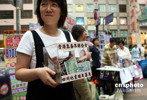 五月十七日,香港眾多團體走上街頭,為四川地震災區(qū)募捐。中新社發(fā) 武仲林 攝