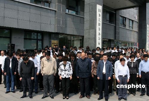 5月19日,國務(wù)院僑務(wù)辦公室全體機關(guān)干部為四川汶川大地震罹難同胞默哀。2008年5月19日至21日為全國哀悼日。中新社發(fā) 張勤 攝