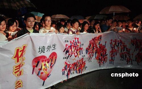 5月19日中國(guó)全國(guó)哀悼日,福建華僑大學(xué)學(xué)子點(diǎn)起蠟燭,齊唱《讓世界充滿(mǎn)愛(ài)》為四川地震受難者祈禱。圖為在校境外學(xué)生手拉條幅,為逝者哀悼、為生者加油。中新社發(fā) 傅丹丹 攝