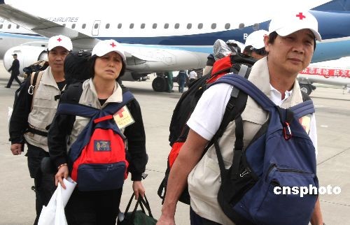 5月20日下午,以陳文長為領隊的臺灣紅十字醫(yī)療隊一行37人以“兩岸直航”的形式乘坐臺灣華信航空的專機抵達成都機場,之后即刻前往汶川大地震的重災區(qū)德陽市開展醫(yī)療救治。中新社發(fā) 任晨鳴 攝