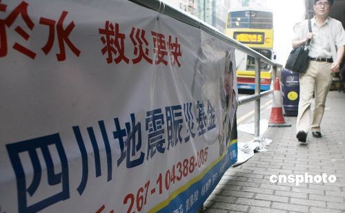 五月二十一日,香港市民走過街頭呼吁各界積極捐款,賑濟四川地震災民的橫幅。香港鳳凰衛(wèi)視此前報道稱,“有慈善捐款傳統的香港目前的捐款額,據說全部加起來已經超過十五億港元,創(chuàng)下香港的紀錄!