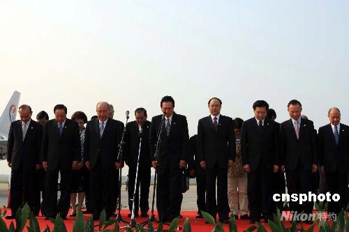 吳伯雄、陳云林等在機(jī)場(chǎng)為四川地震遇難者默哀