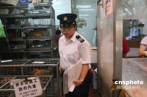 六月七日,香港一名工作人員對(duì)銅鑼灣街市一家活雞攤檔進(jìn)行巡查。香港食物及衛(wèi)生局局長(zhǎng)周一岳當(dāng)日表示,確定月初在保安道街市抽取的五個(gè)雞只樣本,帶有H5N1禽流感病毒,特區(qū)政府對(duì)禽流感的應(yīng)變級(jí)別將由原來的“戒備”級(jí)別,升為“嚴(yán)重”級(jí)別。中新社發(fā) 武仲林 攝
