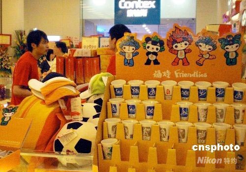 距離北京奧運(yùn)開幕日子越來(lái)越近,香港一些商場(chǎng)銷售奧運(yùn)紀(jì)念品的專柜生意紅火。 中新社發(fā) 洪少葵 攝
