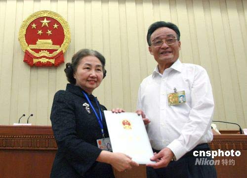 6月26日,全國(guó)人大常委會(huì)委員長(zhǎng)吳邦國(guó)向梁愛詩女士頒發(fā)香港基本法委員會(huì)任命證書。第十一屆全國(guó)人大常委會(huì)第三次會(huì)議當(dāng)天在北京人民大會(huì)堂閉幕,會(huì)議表決通過了全國(guó)人大常委會(huì)香港特區(qū)基本法委員會(huì)組成人員名單。中新社發(fā) 廖文靜 攝