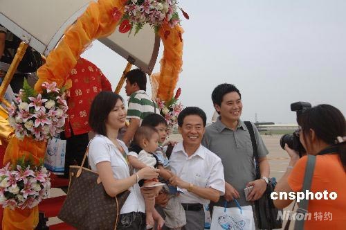 7月4日上午,臺胞羅先生(左一至四)一家四口,在廈門喜乘周末包機(jī)返臺,登機(jī)之時在飛機(jī)舷梯前合影留念,以保存兩岸周末包機(jī)首航的歷史瞬間。中新社發(fā) 鄭祚聲 攝