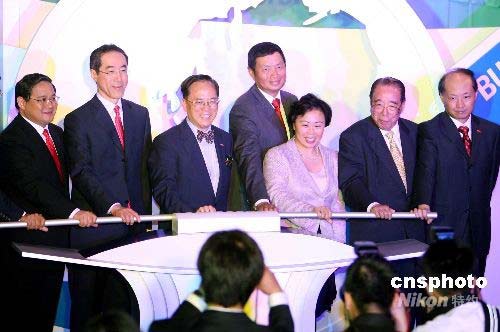七月三日,為慶祝香港國際機場啟用十周年,機場管理局在港麗酒店舉行慶典及酒會,香港特區(qū)行政長官曾蔭權、政務司長唐英年、機場管理局主席張建東等嘉賓主持慶典儀式。中新社發(fā) 洪少葵 攝