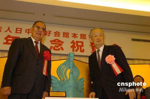 9月5日,日本財團(tuán)法人日中友好會館舉行大型酒會慶祝該會本館建館20周年,中國日本友好協(xié)會會長宋健、中國駐日大使崔天凱、日本眾院議長河野洋平等數(shù)百名中日友好人士出席。圖為宋健會長(左)代表中方向日中友好會館會長林義郎先生贈送賀禮——雕塑作品《鳳凰》。中新社發(fā) 朱沿華 攝