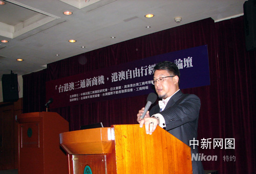 圖為澳門(mén)物流貨運(yùn)聯(lián)合商會(huì)理事長(zhǎng)李國(guó)輝向臺(tái)灣業(yè)界介紹內(nèi)地開(kāi)放自由行后對(duì)促進(jìn)澳門(mén)物流零售業(yè)的幫助及相應(yīng)的運(yùn)營(yíng)經(jīng)驗(yàn)。