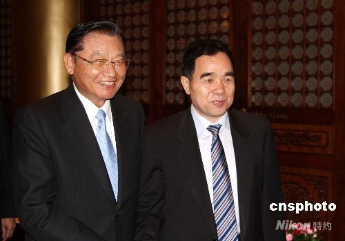 9月19日,臺(tái)灣;鶗(huì)董事長(zhǎng)江丙坤在臺(tái)北圓山飯店,會(huì)見(jiàn)率團(tuán)前來(lái)臺(tái)灣參加海峽兩岸出版交流二十周年紀(jì)念活動(dòng)的部分大陸代表團(tuán)成員時(shí),與新聞出版署署長(zhǎng)柳斌杰(右)在一起。中新社發(fā) 陳立宇 攝