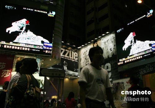 北京時(shí)間二十七日下午四點(diǎn)五十九分,神舟七號(hào)航天員翟志剛成功返回軌道艙,這標(biāo)志著中國(guó)歷史上第一次太空行走成功完成。圖為香港市民在銅鑼灣鬧市通過(guò)大屏幕關(guān)注這一歷史時(shí)刻。中新社發(fā) 武仲林 攝
