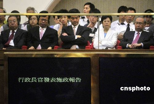 十月十五日,香港行政長官曾蔭權(quán),在立法會(huì)發(fā)表二零零八至零九年施政報(bào)告。特首夫人曾鮑笑薇及多位行政會(huì)議成員出席旁聽。中新社發(fā) 譚達(dá)明 攝