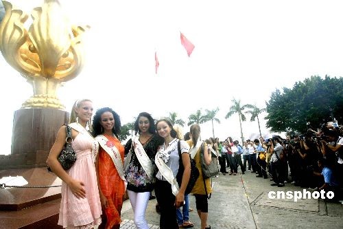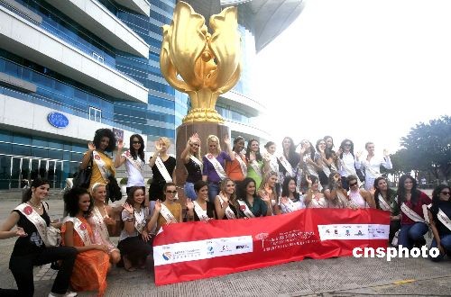 十月三十一日,澳門威尼斯人第四十八屆國際小姐選美大賽2008候選佳麗遨游香港,并在金紫荊廣場合影。中新社發(fā) 張勤 攝