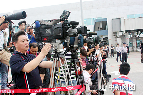 圖:大批媒體在桃園機(jī)場(chǎng)守候陳云林包機(jī)抵臺(tái)