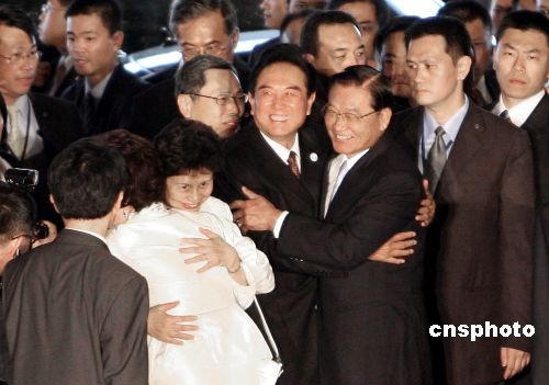 十一月三日,海峽兩岸關(guān)系協(xié)會(huì)會(huì)長(zhǎng)陳云林乘專(zhuān)機(jī)抵達(dá)臺(tái)北,出席“第二次陳江會(huì)談”。;鶗(huì)董事長(zhǎng)江丙坤在圓山飯店舉行歡迎儀式。圖為海協(xié)會(huì)會(huì)長(zhǎng)陳云林進(jìn)入臺(tái)北圓山飯店與江丙坤熱情擁抱。中新社發(fā) 洪少葵 攝