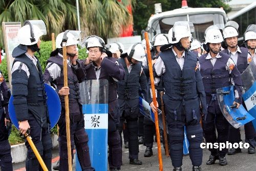 十一月三日,海協(xié)會(huì)長(zhǎng)陳云林率團(tuán)訪臺(tái),臺(tái)灣“警政署”動(dòng)用七千人次警力管制陳云林一行下榻的圓山飯店,臺(tái)中市也調(diào)配三百名警察支持。圖為防爆警察在圓山飯店嚴(yán)陣以待。中新社發(fā) 洪少葵 攝