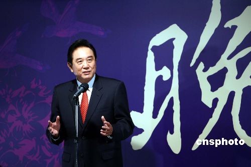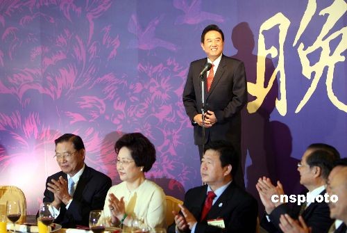 十一月三日晚,臺灣;鶗麻L江丙坤在世界第一高樓臺北101設(shè)接風(fēng)宴,為首次來臺的大陸海協(xié)會會長陳云林接風(fēng)。圖為陳云林在;鶗䴕g迎宴會上致辭感謝。中新社發(fā) 洪少葵 攝