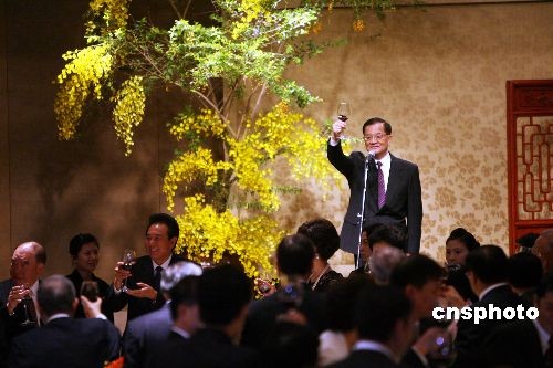 十一月四日晚,國民黨榮譽(yù)主席連戰(zhàn)、連方瑀伉儷在臺北國賓飯店設(shè)宴款待陳云林訪問團(tuán)一行。中新社發(fā) 洪少葵 攝