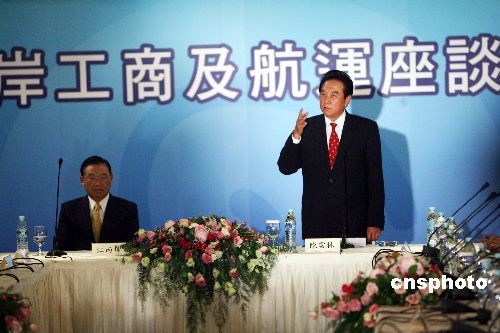 十一月五日上午,兩岸工商及航運(yùn)座談會(huì)在臺(tái)北圓山飯店舉行。海協(xié)會(huì)會(huì)長(zhǎng)陳云林、;鶗(huì)董事長(zhǎng)江丙坤一同出席座談會(huì)。中新社發(fā) 洪少葵 攝