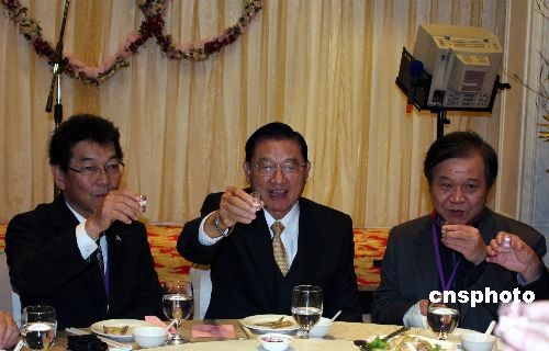 11月26日下午,海峽交流基金會董事長江丙坤(中)抵達(dá)金門,將出席27日舉辦的“福建地區(qū)臺商投資權(quán)益保障研討會”。他表示,希望兩岸共同打擊犯罪、金融登陸等議題能在六個月內(nèi)取得成果。圖為;鶗黹g宴請出席研討會的福建近百位臺商。中新社發(fā) 周兆軍 攝