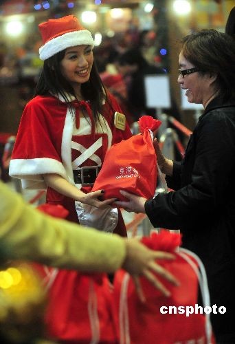 十二月一日,香港一商場舉行“一元圣誕禮品包”優(yōu)惠活動,吸引市民搶購。餐飲業(yè)為了對抗金融海嘯,逾百間食肆和商鋪十二月起會輪流推出一元優(yōu)惠,希望在逆市中刺激消費。中新社發(fā) 譚達明 攝