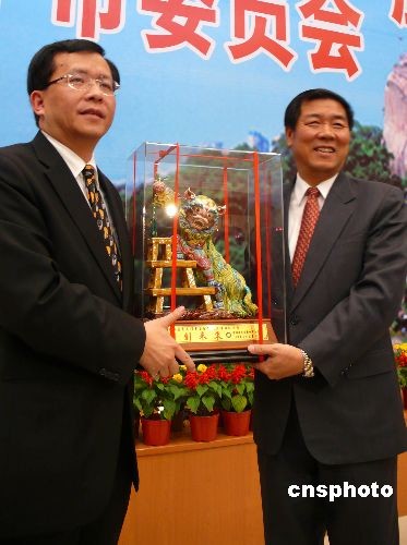 12月1日,中國國民黨臺中市委員會主委張逸華(左)率領(lǐng)參訪團(tuán)一行23人蒞廈參訪。這是國共兩黨展開基層黨務(wù)交流以來廈門與臺中市之間第3次互訪。圖為中共廈門市委書記何立峰(右)會見海峽彼岸貴賓之后雙方互贈禮物。中新社發(fā) 楊伏山 攝