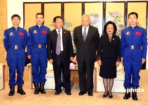 十二月六日,全國(guó)政協(xié)副主席董建華在中央人民政府駐香港聯(lián)絡(luò)辦公室會(huì)見“神舟七號(hào)”載人航天飛行代表團(tuán)一行,并與代表團(tuán)團(tuán)長(zhǎng)及三名航天員合影留念。中新社發(fā) 張勤 攝