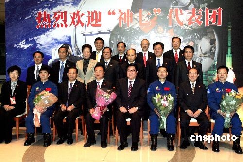 十二月六日,“神舟七號(hào)”載人航天飛行代表團(tuán)拜會(huì)中央人民政府駐香港聯(lián)絡(luò)辦公室(中聯(lián)辦)。中新社發(fā) 張勤 攝
