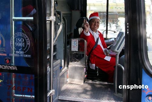圣誕節(jié)將至,臺北市有的客車司機穿上了圣誕老人的服飾,以活躍氣氛。圖為12月20日,一輛長途客車的司機正準(zhǔn)備載客出發(fā)。中新社發(fā) 陳立宇 攝