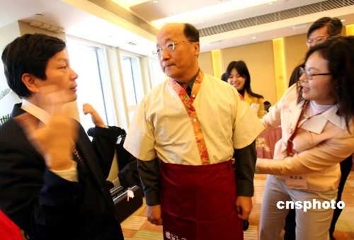 一月八日,臺(tái)灣中部四縣市在香港世貿(mào)中心舉辦“中臺(tái)灣迷你旅展及特產(chǎn)展”活動(dòng)。圖為臺(tái)中市長(zhǎng)胡志強(qiáng)穿上民族服飾,向媒體宣傳臺(tái)灣中部的特色景觀。中新社發(fā) 洪少葵 攝