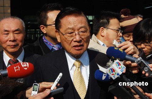 一月九日上午,海協(xié)會與海基會聯(lián)合參訪團(tuán)在廣州考察一家臺資企業(yè)。考察結(jié)束后,臺灣海基會董事長江丙坤接受兩岸記者聯(lián)合采訪。中新社發(fā) 柯小軍 攝