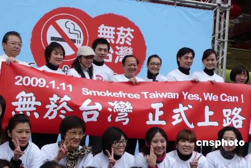臺(tái)灣新“煙害防制法”十一日起正式實(shí)施,三人以上室內(nèi)職場(chǎng)及公共空間禁煙,至少影響五十萬個(gè)場(chǎng)所,煙品促銷廣告也大幅限縮,違者加重罰則!靶l(wèi)生署”署長(zhǎng)葉金川(右四)十日在街頭宣導(dǎo)臺(tái)灣煙害防制新法,呼吁大家共創(chuàng)無煙臺(tái)灣。中新社發(fā) 路梅 攝
