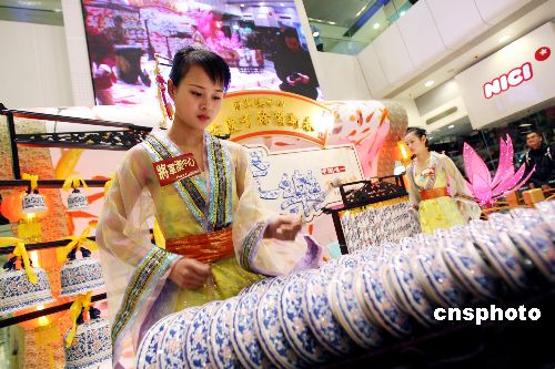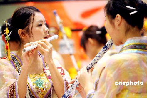 一月十五日,景德鎮(zhèn)青花女子瓷樂(lè)團(tuán)成員以仿唐宮廷服飾裝扮在香港將軍澳中心吹奏瓷簫、瓷笛。首次訪(fǎng)港的景德鎮(zhèn)青花女子瓷樂(lè)團(tuán)將于新春期間在香港多個(gè)大型商場(chǎng)巡回演出。中新社發(fā) 洪少葵 攝