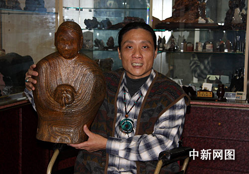 臺(tái)灣知名殘障木雕家林正發(fā),年青時(shí)不幸因車禍而不良于行。但并沒因此喪志。反而一心致力于木雕藝術(shù)的創(chuàng)作。成為一個(gè)自食其力的人。曾多次獲臺(tái)灣木雕比賽大獎(jiǎng)。圖為林正發(fā)和他的新作“佑”。以抽象的藝術(shù)手法來表現(xiàn)虔誠(chéng)的宗教觀念。