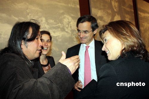 法籍華人畫家嚴(yán)培明個(gè)人畫展《蒙娜麗莎的葬禮》二月十一日晚在巴黎盧浮宮博物館德農(nóng)廳揭幕。圖為嚴(yán)培明(左)在畫展揭幕式上與法國藝術(shù)界人士交流。中新社發(fā) 吳衛(wèi)中 攝