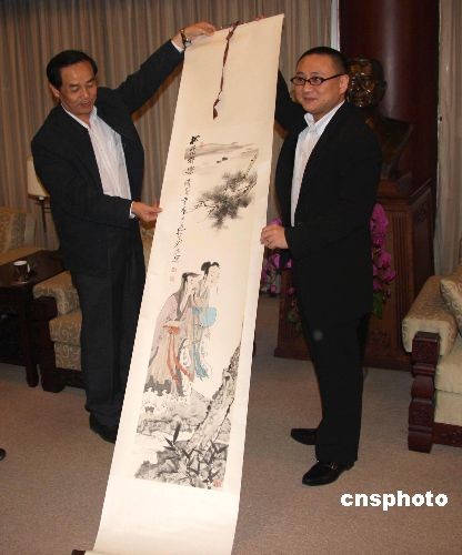 三月二十五日,由十七家大陸中央媒體負(fù)責(zé)人組成的訪問團(tuán)拜訪臺(tái)灣《聯(lián)合報(bào)》。圖為訪問團(tuán)團(tuán)長(zhǎng)、《人民日?qǐng)?bào)》總編輯吳恒權(quán)(左)向《聯(lián)合報(bào)》贈(zèng)送禮品。中新社發(fā) 耿軍 攝