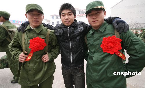 12月11日下午,家住安徽蒙城縣漆園辦事處城北村的雙胞胎兄弟鄭根林、鄭隨林同時參軍,起程開赴各自部隊開始多彩的軍營生活。鄭家兄弟自幼羨慕軍營生活,今年冬季征兵開始后,兄弟倆一起報名參加體檢和政審,并雙雙通過,被解放軍某部和武警某部批準入伍,雙胞胎兄弟同時參軍入伍在當?shù)貍鳛榧言。中新社發(fā) 胡衛(wèi)國 攝