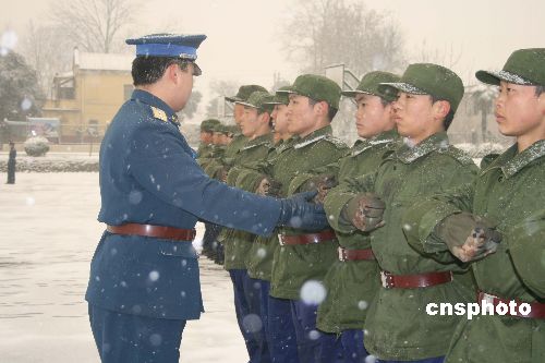 1月12日,西安下起2008年首場(chǎng)大雪,駐守陜西的空軍某部對(duì)新兵進(jìn)行訓(xùn)練。中新社發(fā) 尤中原 攝