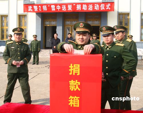 2月3日,駐江蘇宜興武警部隊舉行“雪中送炭”捐款活動,官兵們向宜興慈善會捐款73540.5元,這些善款不久將轉(zhuǎn)送到災(zāi)民手中。中新社發(fā) 丁煥新 攝