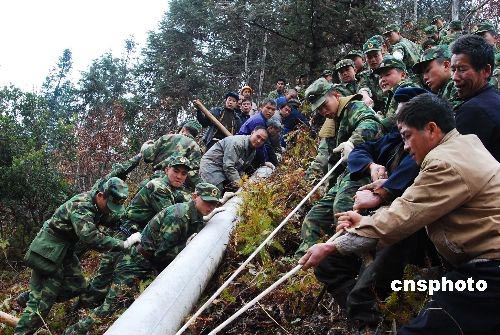 圖:中國廣西駐軍幫助冰凍災(zāi)區(qū)搶修電力設(shè)備