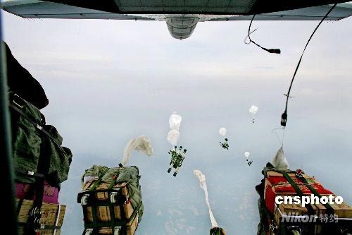 5月23日,空軍大型運輸機實施空投食品、帳篷等物資。中新社發(fā) 賁道春 攝