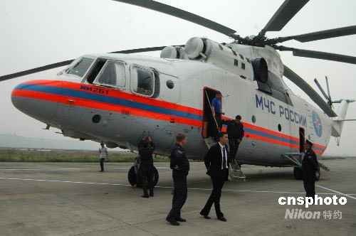 5月25日下午17時45分,一架俄羅斯米-26重型運輸直升機降落四川綿陽南郊機場。據(jù)俄羅斯機長安東介紹,米-26重型運輸直升機可24小時晝夜飛行,可在能見度600米、高度60米的空域執(zhí)行任務。10名機組人員經(jīng)常參與國際救援任務,對山區(qū)復雜地形執(zhí)行救援任務有著豐富經(jīng)驗。米-26是目前世界上最大的直升機,被稱為“空中巨無霸”,一次運載能力達20噸。中新社發(fā) 成和平 攝