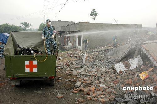 5月下旬,海軍衛(wèi)生防疫消殺突擊分隊的防疫車對四川地震災區(qū)民房進行預防性消毒。截至到5月30日上午,由86名專業(yè)隊員組成的衛(wèi)生防疫消殺突擊分隊已完成對四川綿竹、什邡等地震重災區(qū)60多個市區(qū)街道、村莊的廢墟、房舍、疑似疫源地等場所進行衛(wèi)生防疫和消毒殺菌,有效地控制了災區(qū)的疫情隱患。中新社發(fā) 李唐 攝